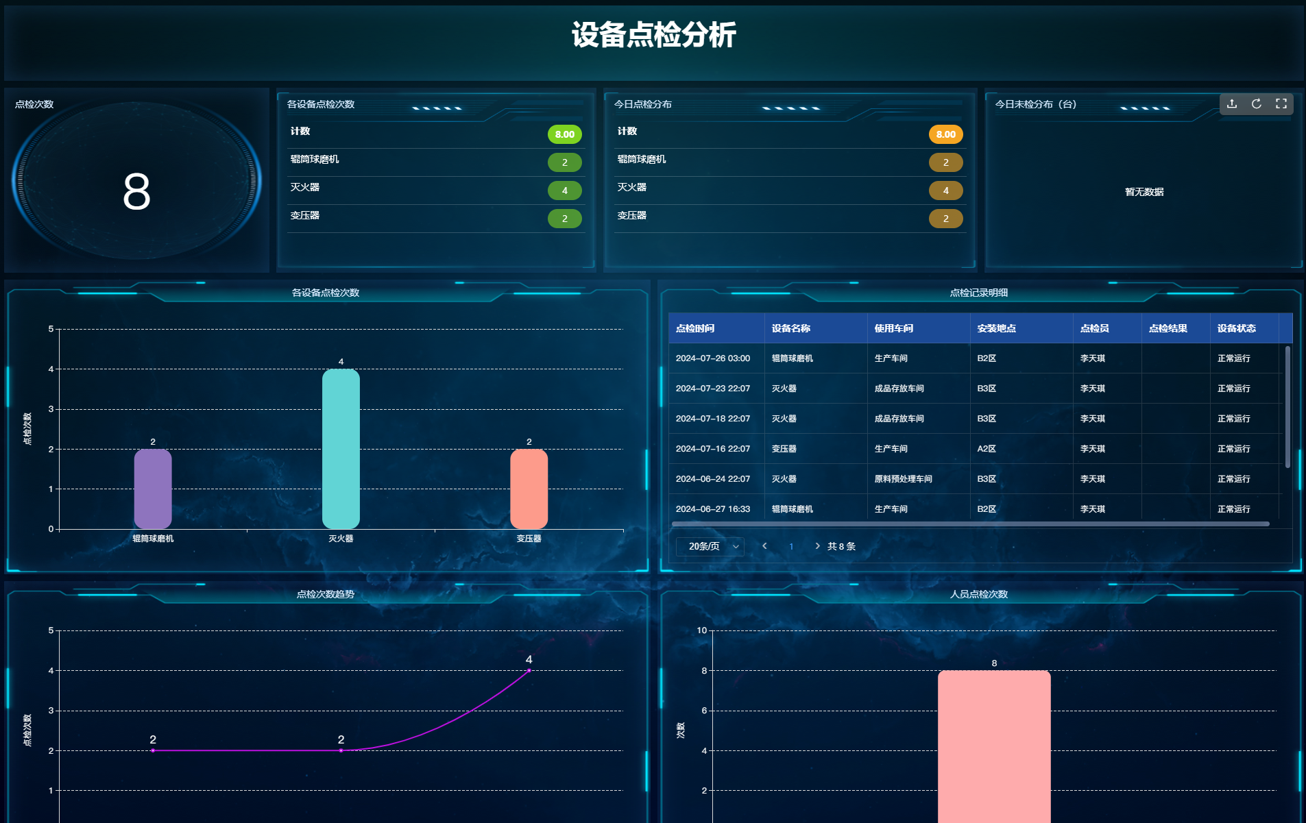 1、可以制作一个任务台账,具体到任务时间,周期及负责人; 2、生成免登二维码贴在检查物上,方便快捷; 3、检查后自动升的检查表看板,可以看到详细看到检查内容; 4、检查中出现异常系统会自动统计,并通知相关人员; 5、帮助管理者统计处检查次数及异常次数,方便后期维护和调整。